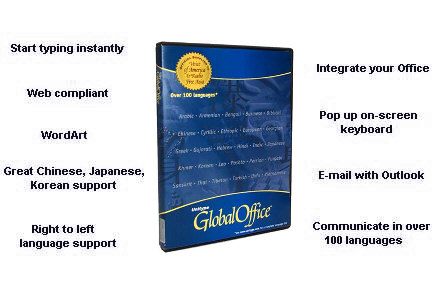 Unitype Global OfficeTM is an enhancement to Microsoft Office that adds text entry and visual keyboard display in over 100 different languages to these Microsoft Office products: Word, Outlook, Excel, PowerPoint. (Click here for version/application support.) It is easy to use, yet powerful enough to support the most demanding tasks of businesses, translation professionals*, and academics worldwide.Best of all, everything you need is on one CD-ROM.